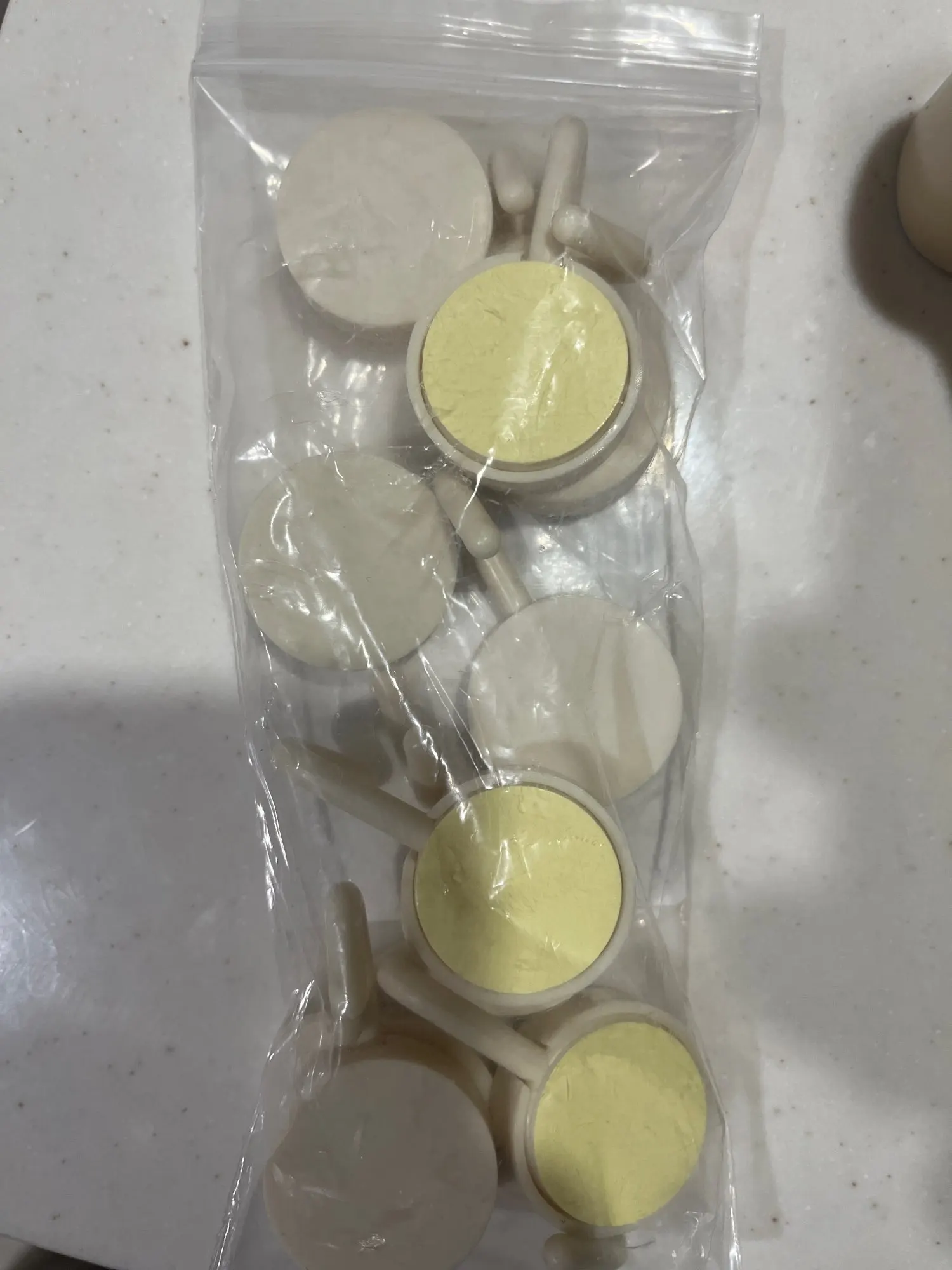 Whitney Fisher Plastic. They hold well. After sticking, it is difficult to peel off. They are ok.